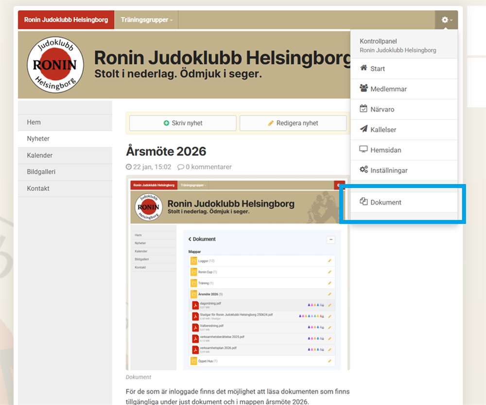 För de som är inloggade finns det möjlighet att läsa dokumenten som finns tillgängliga under just dokument och i mappen årsmöte 2026.